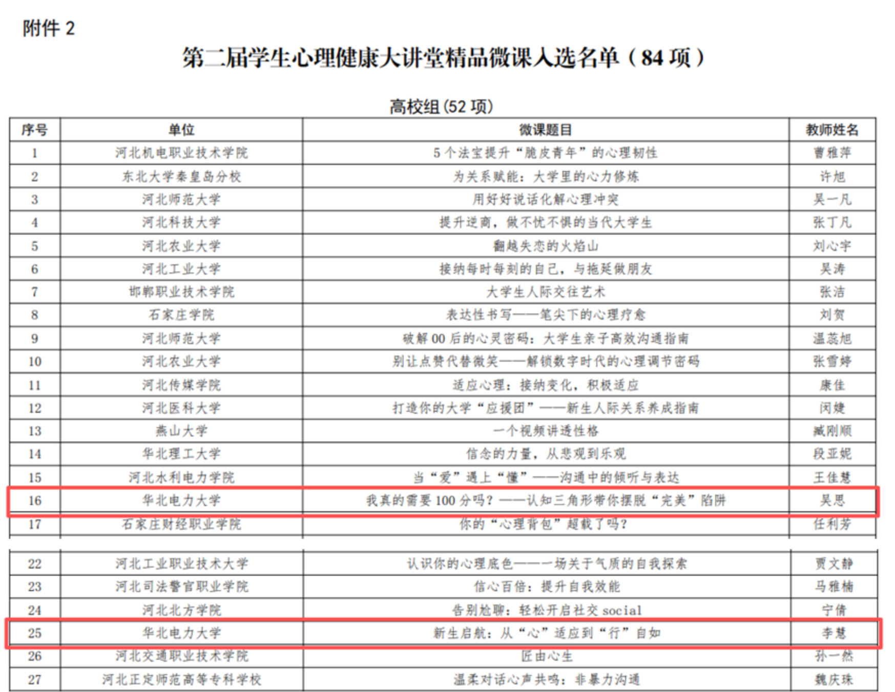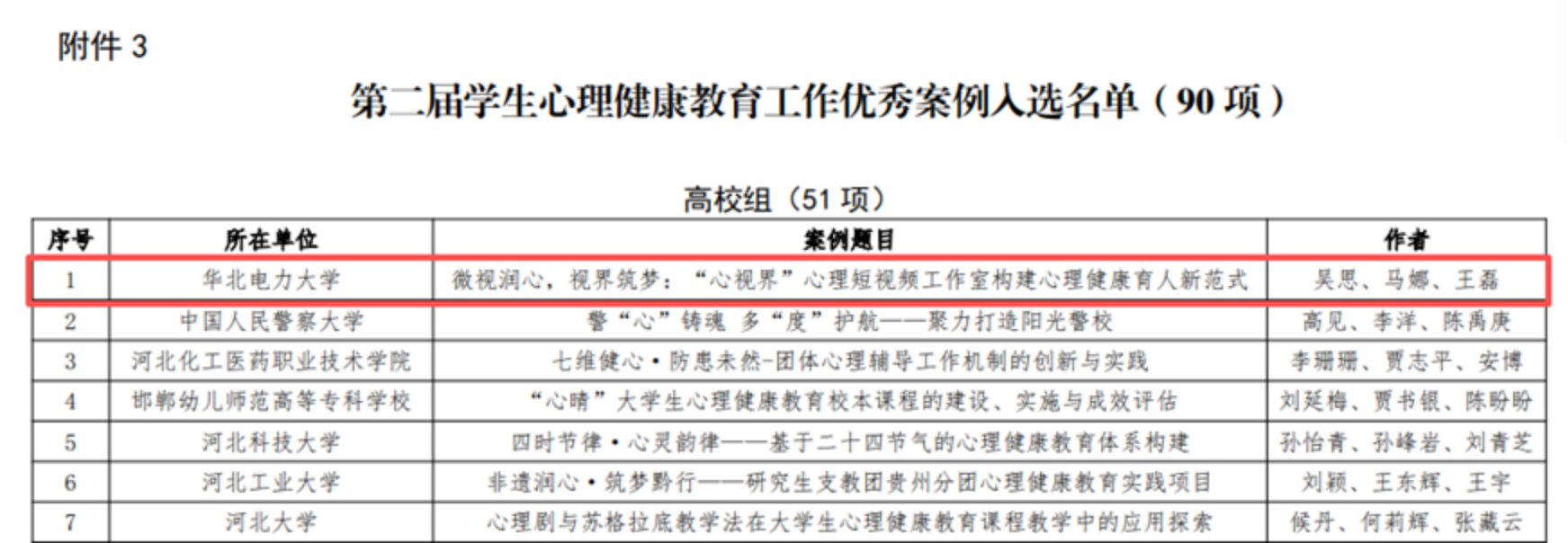 本次获奖作品均为心理工作和视频形式融合的成果,由学生处(保定)“心视界”心理短视频工作室统筹策划、重点培育。《微视润心,视界筑梦:“心视界”心理短视频工作室构建心理健康育人新范式》,系统介绍了我校心理工作与视频相融合的创新工作实践和显著成效,入选学生心理健康教育工作优秀案例。《剧本儿》凭借师生们对心理健康问题的生动演绎,入选优秀校园心理情景剧。《我真的需要 100 分吗?——认知三角形带你摆脱“完美”陷阱》和《新生启航:从“心”适应到“行”自如》,以专业且实用的知识讲解,入选学生心理健康大讲堂精品微课。