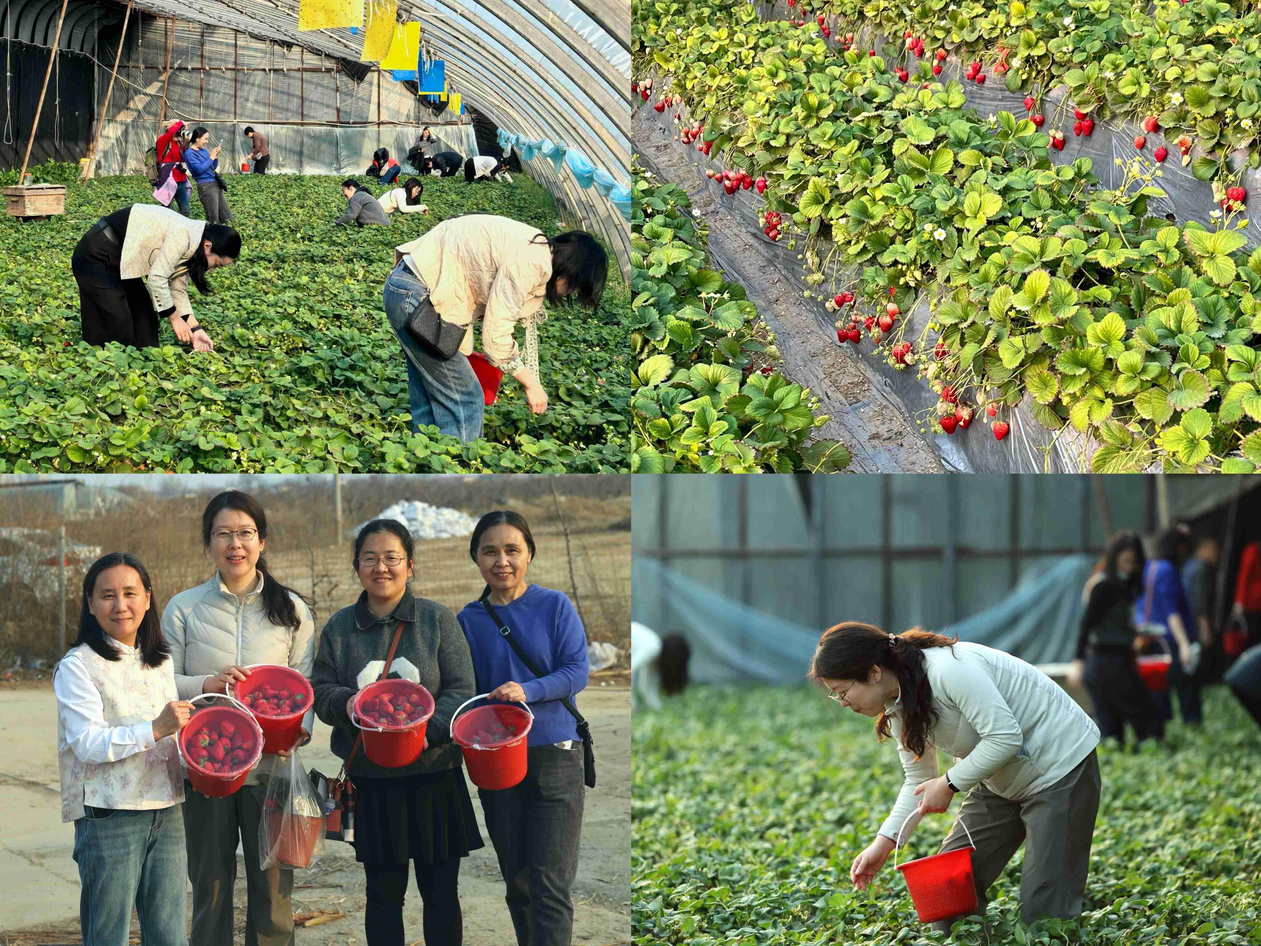 转场至一亩泉村,草莓大棚里香甜气息扑面而来。草莓硕果累累、鲜艳欲滴,老师们手提果篮,一边采摘一边品尝,互相交流着如何辨别草莓是否成熟、味甜等,也向基地人员请教采摘技巧、植株培育知识,气氛轻松愉快,欢声笑语不断,草莓棚里留下了许多令人难忘的回忆。