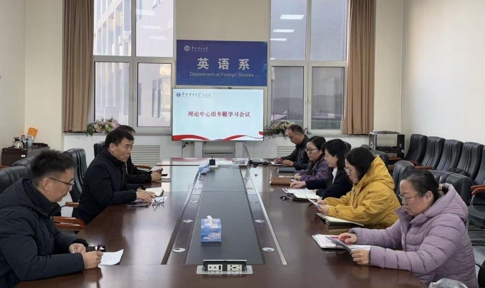 本网保定讯:12月24日下午,英语系理论学习中心组在教十一楼D106召开扩大会议,专题学习《求是》杂志发表的习近平总书记重要文章《推进党的自我革命要做到“五个进一步到位”》。会议由党委书记武彦军主持,英语系领导班子成员、党委委员、两办党员教师参加了学习。