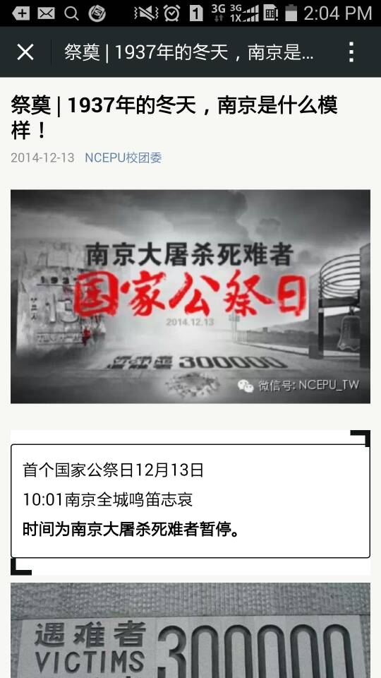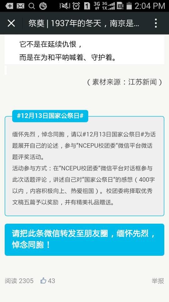 13日当天,校团委微信平台“NCEPU_校团委”发布首个国家公祭日宣传特辑《祭奠 | 1937年的冬天,南京是什么模样!》,同时开展了线上微话题互动,鼓励广大师生发表感想评价,引起师生的强烈反响,截止至14日凌晨,该微信宣传单图文点击量突破2558人次,分享转发469人次,收到评论投稿213份,校团委择选优秀评论文章在15日微信平台中发表,并号召各学生组织也通过各自微信、人人网等宣传窗口发布国际公祭日相关报道和介绍,均取得不错的反响。