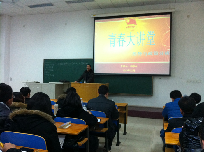 本网保定讯:12月5日下午,由校团委举办的“青春大讲堂”在教十一B101教室拉开帷幕,法政系公共事业管理教研室主任、副教授李冰水以“当前国内形势与政策分析”为主题,就中国当今社会心态存在的问题为听众们进行了深入的解读。共青团保定市委书记杨跃峰、副书记蔡红星,校团委书记赵冬鸣、副书记商雷与团市委全体机关干部、校级学生干部200余人一同聆听了此次讲座。