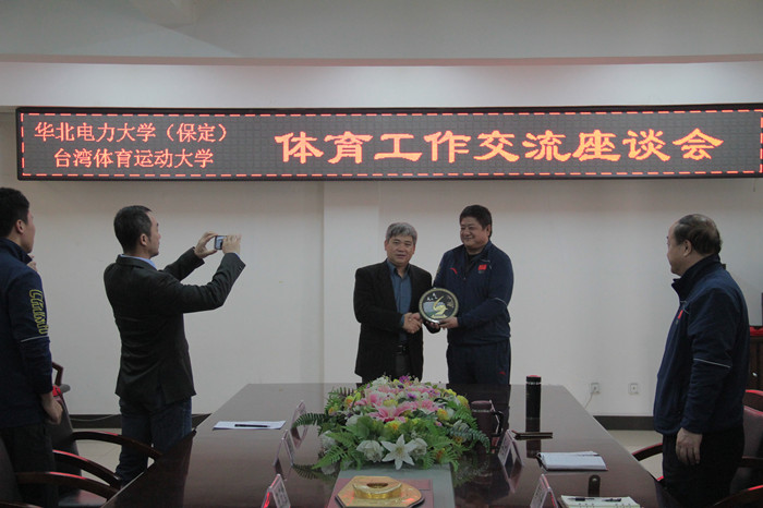 高亦扬老师首先介绍了参加座谈会的台湾体育运动大学及体育教学部的领导和老师,并由房游光主任代表我校,特别是体育教学部对台湾体育运动大学的领导和老师的到来表示了热烈的欢迎和真诚的感谢,他全面系统地介绍了我校体育教学部教学、训练、科研、《大学生体质健康标准》的实施、日常管理等相关工作。台湾体育运动大学产业学院院长王庆堂教授就能有机会来到我校进行座谈表示了由衷的谢意,并向我们介绍了与会的台湾体育运动大学的老师及产业学院的基本情况。随后,房游光主任代表我校向台湾体育运动大学赠送了华北电力大学校徽。双方与会老师就跆拳道的训练与发展,台湾运动休闲项目的开展与发展趋势,我校体育教学与运动训练现状及发展特色,高水平运动队建设与管理等相关问题展开了深入的交流和探讨。最后,李全化书记肯定了两所高校体育工作在各自发展领域所付出的努力及取得的丰硕成果,并深入总结了保定校区体育教学部近几年在运动训练中取得的突破性进展和发展思路。台湾体育运动大学对我校各项体育工作给予了高度评价,并高度赞赏我校体育工作突出特色,抓住重点的工作思路及取得的优异成绩。通过座谈,促进了两校体育工作的交流与合作,开阔了眼界,丰富了视野,为两校体育工作的深入开展夯实了基础。