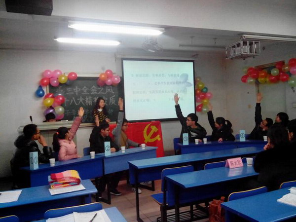 黑板上的乘三中全会之风、悟八大精神实质的大字及挂着的鲜艳的党旗,预示着这将是一场激烈的角逐。果不其然,一个短片之后,在郭巍学姐的主持下,活动便进入了正题。