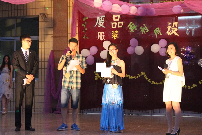 接着,B组的作品展示及解说开始。第十一组 “蒙萌萌”用白色纸条流苏裙摆、荧光绿纸条腰带和蓝色塑料袋小花组合成的服装,透露出一股清新的气息。第十二组 “孔雀公主”一出场便引起了热烈的欢呼:男模特金黄色的上衣闪闪发亮,白色的裙摆透着一股高贵气质,树枝做成的头饰和面具更是锦上添花。第十三组 “简净”简单大方的设计、第十四组条状裤子的创意,第十六组黑白长裙的霸气设计,第十七组“萌萌哒”的蚊帐利用,第十九组“费神队”的运动风,以及第二十组头戴美丽花环的“森林公主”,各具特色,或新颖时尚,或简约大方,都赢得了评委的肯定。第十五组“梨花白”寓意真爱穿越千年的汉服,表达了闺蜜之间纯真的友情。第十八组“小白兔”讲述了他们制作服装的过程:为了整理随处乱放的传单,将传单卷成冰淇淋状纸卷,一针一线缝在废旧纸伞做的裙摆上。B组的走秀同样精彩,尤其是“孔雀公主”的走秀,大胆的步伐和幽默的动作,使现场气氛达到了高潮。