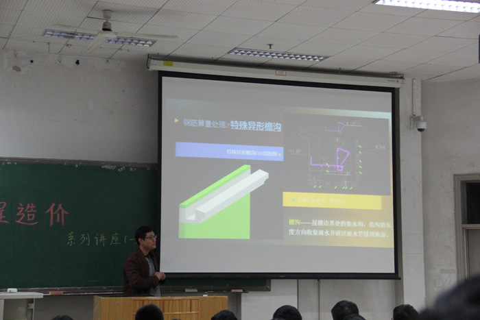 特殊异性檐沟和屋面梁结构找坡的钢筋算量处理是此次讲座的重头戏,姜巍对其进行了详细细致的讲解。首先,姜巍用“燕子筑巢”的例子引导同学们认识了檐沟并阐述了其严谨定义,以清晰的CAD剖面图解释了工程造价的专业名词纵筋和箍筋,展示了相关模型的基本构造及专有特点。在简明扼要地解释了特殊异性檐沟的手工算量之后,姜巍用工程造价专用软件——广联达钢筋算量软件向同学们展示了特殊异性檐沟工程量电算的操作步骤和基本规范。接着,就屋面梁结构的集中标注和原位标注作了分析。他提到,屋面梁结构传统的手工算量存在“纵筋倾斜、腰筋倾斜、箍筋个数计算、箍筋长度渐变”四个难点,侧面突出了电算方便、快捷、准确的优势,之后用广联达钢筋算量软件展示了屋面梁结构找坡的钢筋算量处理。