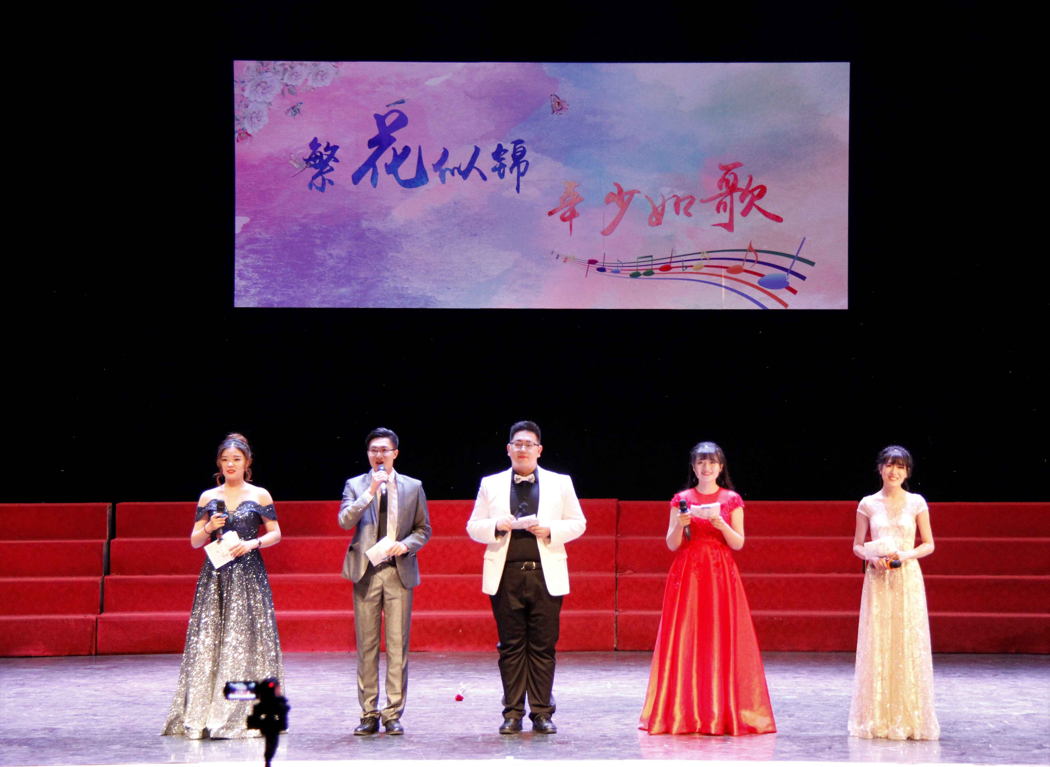晚会在一段扣人心弦的开场视频中拉开帷幕,引出了“繁花似锦,年少如歌”的晚会主题,也渲染了场内依依惜别的气氛。晚会的开场节目是歌曲《故乡》与《西湖》的连唱,沉稳的鼓点、质朴的吉他和着歌手温润的嗓音稳定场内观众的心绪。开场节目结束后,主持人宣布晚会开始,动力系党委书记李秋夫老师致词表达了对全体毕业生的祝福。