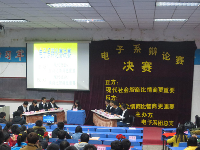 本网保定讯:11月30日晚,由电子系团总支主办的电子系辩论赛决赛在教六二阶成功举办。各系辩论队队长、团总支副书记等作为嘉宾出席本次比赛。