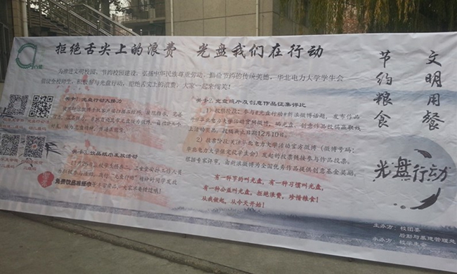 本网保定讯:近年来,厉行节俭反对铺张浪费逐步成为社会的潮流。为响应习近平总书记提出的厉行节俭的号召,深入落实 “千万青少年光盘行动微博接力”主题活动的文件要求,依照团省委学校部、省学联秘书处的指示,由华北电力大学学生会组织为期两周的“拒绝舌尖上的浪费,光盘我们在行动”系列活动正式启动。