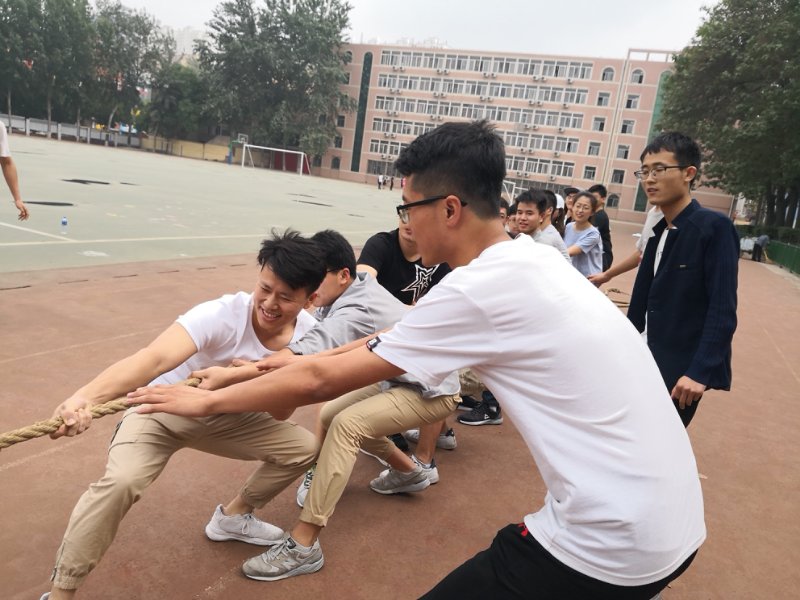 拔河比赛中每位同学都积极投入,比赛的哨声响起,参赛的队员们紧握长绳,卯足了劲拼命往后拉,未参赛的同学们自发组成啦啦队为比赛队员呐喊加油,哨子声、呐喊声此起彼伏,现场激烈的比赛将整个活动推到了高潮。整个过程中,各组参赛队员努力拼搏,无论是场上还是场下,气氛都异常激烈。