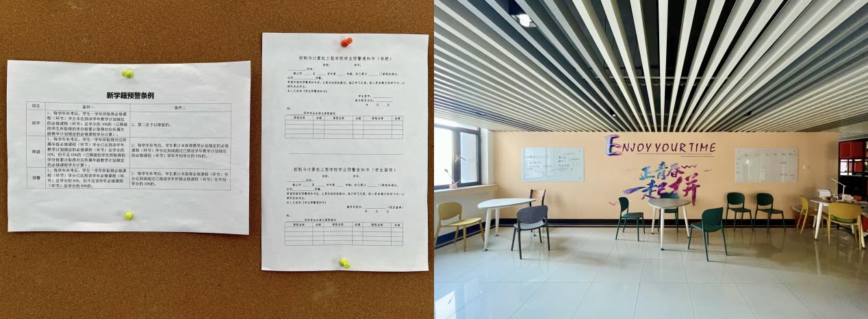 强化制度保障,探索多种学业支持方式。加强对学生学习的日常管理,围绕学生、关照学生、服务学生。学院严格落实北京市和学校关于深度辅导和遍访宿舍的要求,每月一次进宿舍,及时关注学生学习和生活情况;同时在学院的要求下,进课堂、进考场,每名辅导员每周旁听2节专业课,了解掌握学生学习状态。贯彻课程思政理念,发挥专业课教师在课堂学风塑造、专业深造中的指导作用。充分调动党团学生干部力量,成立学风督查教师小组和学生小组,发挥学生骨干在学风建设中自我教育、自我管理、自我服务作用,一定程度上有效提高了学生出勤率、抬头率。强化诚信考试和警示教育,严格落实考试违纪处理规定,督促学生自觉遵守校规校纪。做好学业预警工作,设置《学籍预警条例》和《学业预警通知书》,为预警学生配备一对一学业辅导员,有针对性开展学业帮扶。加强楼宇文化建设,保障基础条件,在主楼E座走廊空地设置学习区,配备桌椅、白板等学习用品,为学生自习、互动交流创造良好条件。