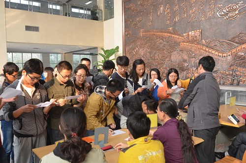 本网保定讯:10月23日下午,首届“搜书大赛”在保定校区图书馆拉开了帷幕。下午3时,近四十名跃跃欲试的参赛者聚集在图书馆二楼大厅,脸上写满了兴奋。参赛选手分两批进行比赛,最后决出一、二、三等奖。很多围观的同学受到热烈气氛的感染,现场即兴报名参加。