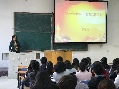 此次党课紧密结合“十九大”内容,从党组织的基层结构讲起,逐步引入十九大产生的中国共产党第十九届中央委员会,他们是领航新时代的坚强的领导集体。李红霞为学生们清晰解释了“中国梦”与“两个一百年”的具体内容和十九大后党章新修订的内容进行了细致地解读,对于党章不可动摇的地位多方位深刻阐述。最后,李红霞为给每一位培训班学员讲解了入党的必要条件、入党动机等加入党组织的必要条件,并对通过引用习总书记在十九大报告中的话,对每一位在做青年寄于了要“有理想有本领 有担当”的殷切期望。