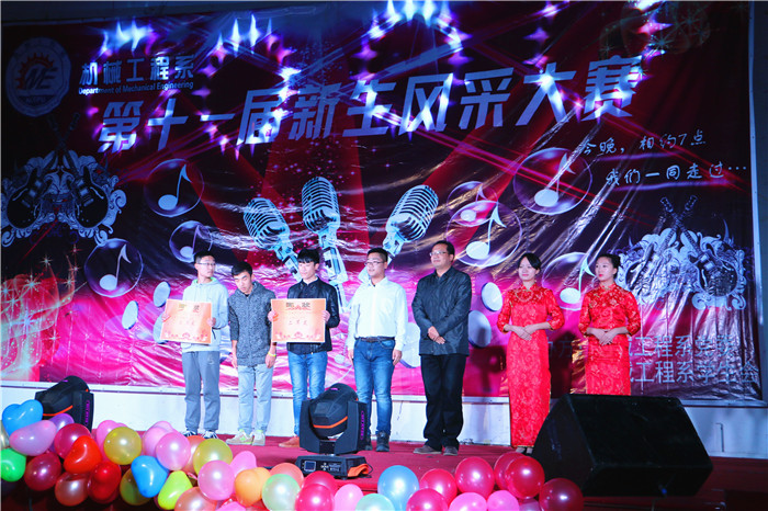 本网保定讯:11月19日晚,由机械系党委主办、系学生会承办的第十一届新生风采大赛在文体中心举办,机械系党委书记葛永庆、党委副书记齐岩、团委书记兼15级辅导员贺运政、12级辅导员郄力博和部分机械系教师出席此次大赛并担任评委。