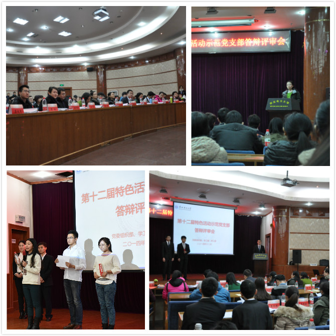 今年的特色活动示范党支部创建活动从6月份开始启动,各支部结合十八届三中全会和习近平总书记系列重要讲话精神及我校党员先锋工程实施计划整体要求,围绕理论学习、党员助学、志愿服务及党员责任区认领等工作开展了大量形式多样,内容丰富的活动。进入评审表彰阶段以来。在支部申报、院系推荐和网络博客展示的基础上,最终确定了20个支部晋级到现场答辩评审。