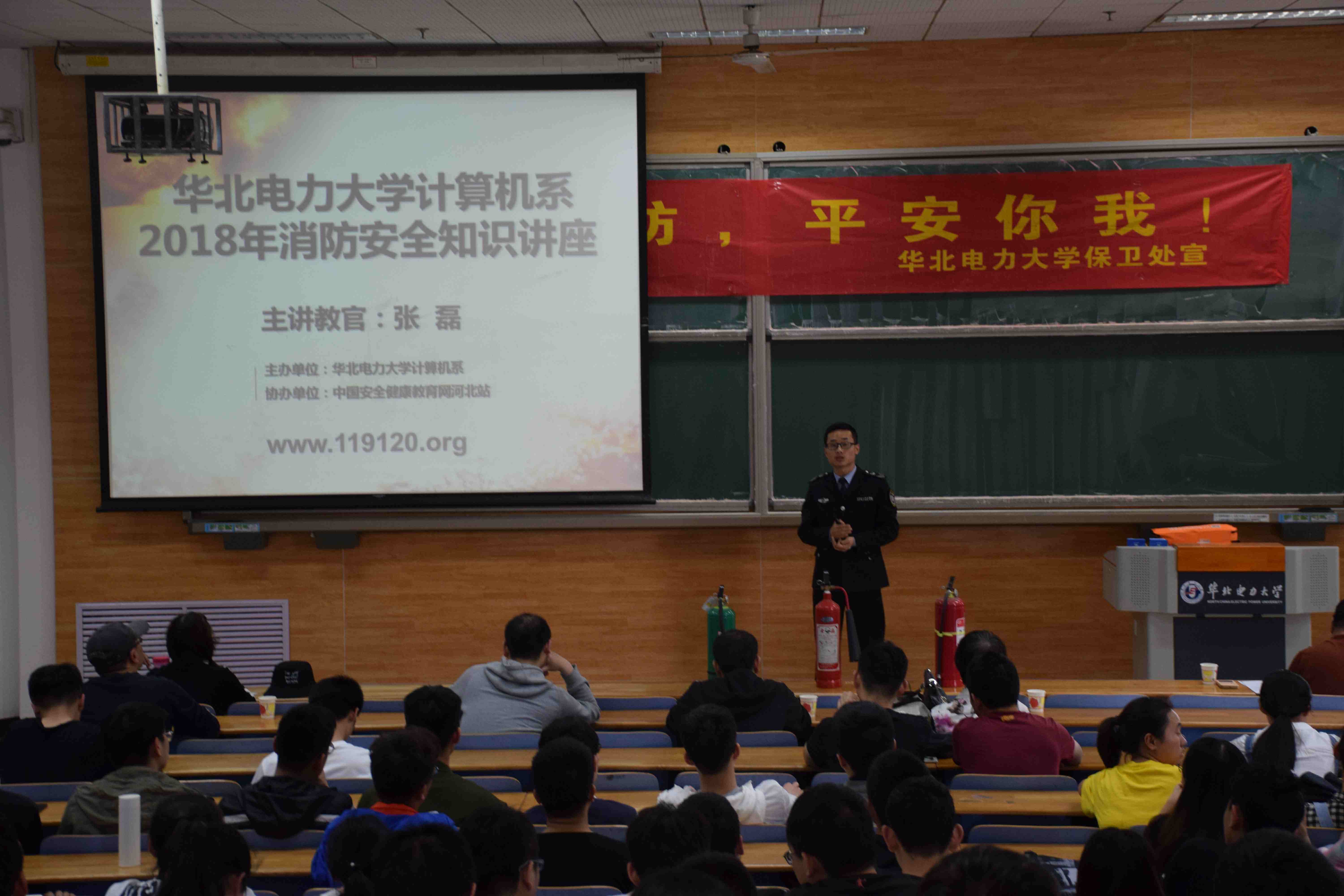 本网保定讯:4月19日,为响应我校第三十二个安全教育宣传月的号召,计算机系党委在教十B101开展了“建设平安校园,喜迎校庆甲子”系列活动之消防知识培训。我校保卫处王俊卿、河北省五进消防培训中心张磊受邀参加此次培训活动,并进行了精彩的消防知识讲解。计算机系各科室教师代表以及各年级学生代表参与了此次培训活动。