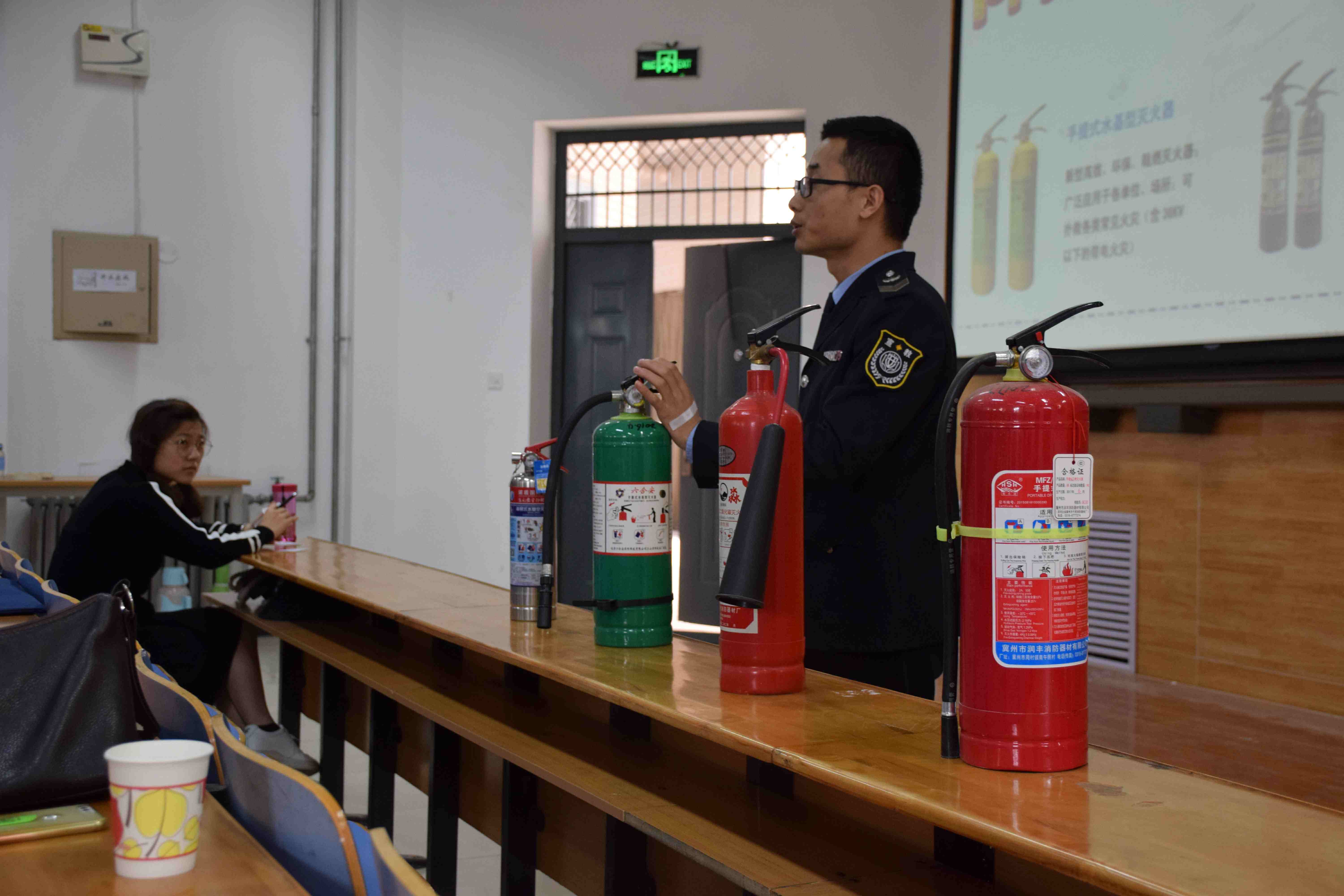 14时30分,消防知识培训活动正式开始。首先,张磊结合新闻事实阐述了火灾巨大的危害性,号召全系师生对消防工作要树立“预防为主”的意识,掌握“一懂”“三会”,了解消防知识,消除安全隐患。接着,王俊卿就灭火器的种类以及使用方法进行讲解,并与现场师生进行互动,用诙谐风趣的语言提醒我系师生重视消防安全,学习消防知识。