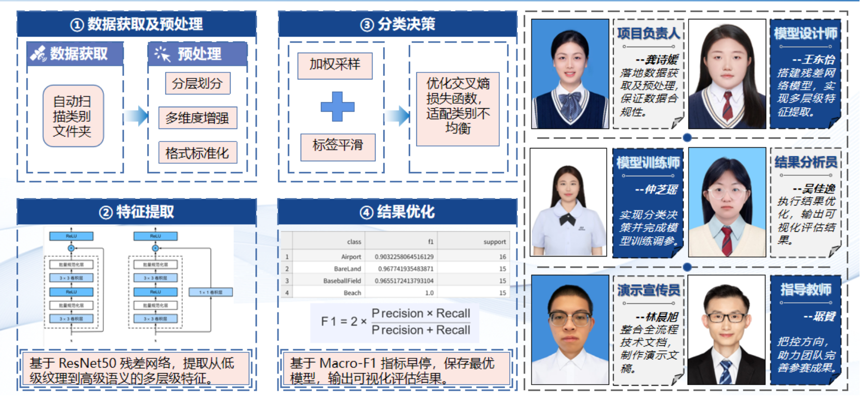 本次大赛以“创享青春 智启未来”为主题,聚焦人工智能技术的实际应用,其中“遥观万象 遥感图像智能分类”赛题紧密对接国土监测、生态保护等实际场景需求,吸引了众多高校队伍参赛。面对遥感图像分类中的长尾分布、跨区域泛化难等技术挑战,星遥队在琚贇副教授的指导下,组建了由龚诗媛、王东怡、仲芝瑶、吴佳逸、林晨旭五名同学组成的团队,针对性开展技术攻关。