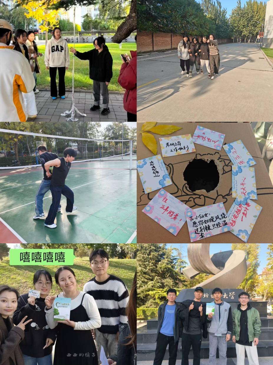 活动中,各参赛队伍迅速投入挑战,校园各处洋溢着青春的活力与协作的热情。在文化广场“知识寻迹”任务点,队员们通过细致搜寻与高效分工,合力找出隐藏在广场各处的心理学书籍卡片。在文体中心旁的“秋日心语”打卡点,同学们在卡片上认真书写祝福,传递温暖。在“默契同心”打卡点,参赛队员背靠背协作运球,口号一致、步调统一,展现出高度的默契。在“四人五足”打卡点,队员们腿绑腿、手挽手,在相互扶持中稳步前行。压轴的"合力筑塔"项目更将团队协作推向高潮,队员们热烈讨论搭建方案,共同完成纸塔搭建。当高塔稳稳立起,现场响起阵阵欢呼。活动结束后,同学们纷纷表示,此次活动不仅重新解锁了校园的全新打开方式,增强了大家对校园的认同感与归属感,更在相互支持、相互鼓励中,增进了对彼此的了解与信任,在团结协作中建立了深厚情谊。