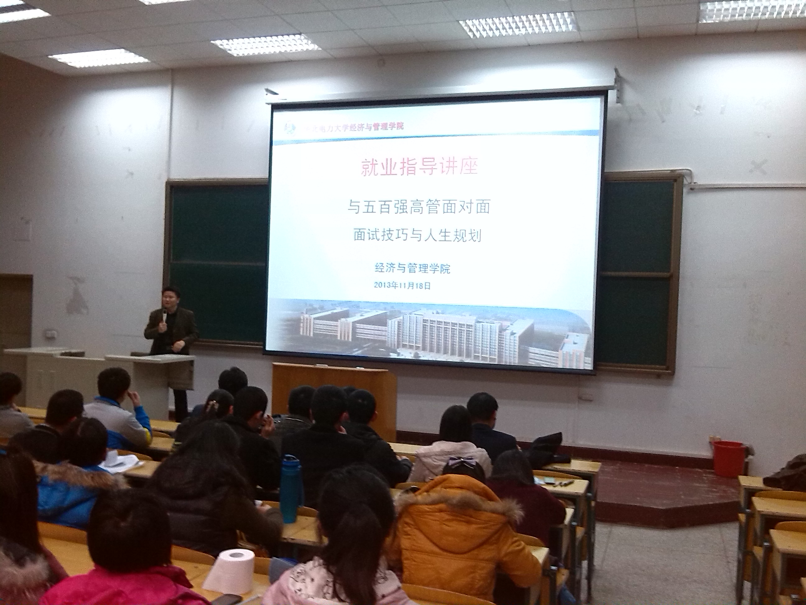 11月18日晚,经济与管理学院根据当前的学生需求,有针对性地组织举办了就业指导讲座。本次讲座由安永咨询公司亚太区总监王磊和中国体育彩票运营管理有限公司风险控制部负责人高屹然主讲。经管学院党总支副书记赵军伟,电力经济管理教研室主任、工商1101班班主任刘敦楠老师出席了本次讲座,2014届有就业意向的同学全体列席。讲座由刘敦楠老师主持。