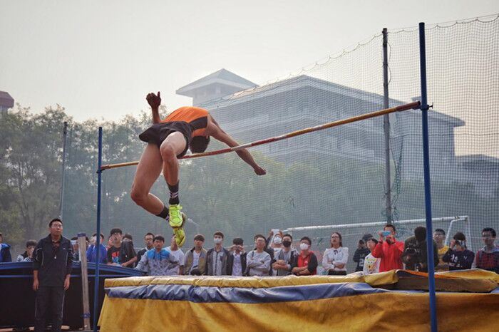 他准备,微凸的助跑线,起跳转身,推身向前,背越。这一系列动作完成只在短短几秒,却给在场观众留下无限震撼。
