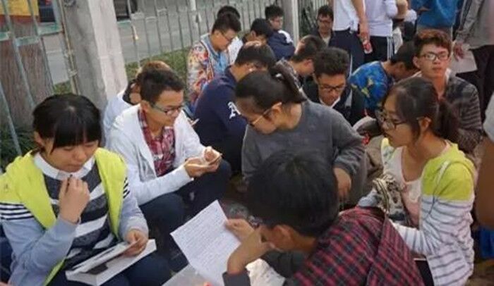 坐在小马扎上,手里捧着厚厚的书本和一大打华电信纸,笔尖在慢慢移动,时而和身边的同学交流两句,时而点头示意,接着又投入到创作中去。
