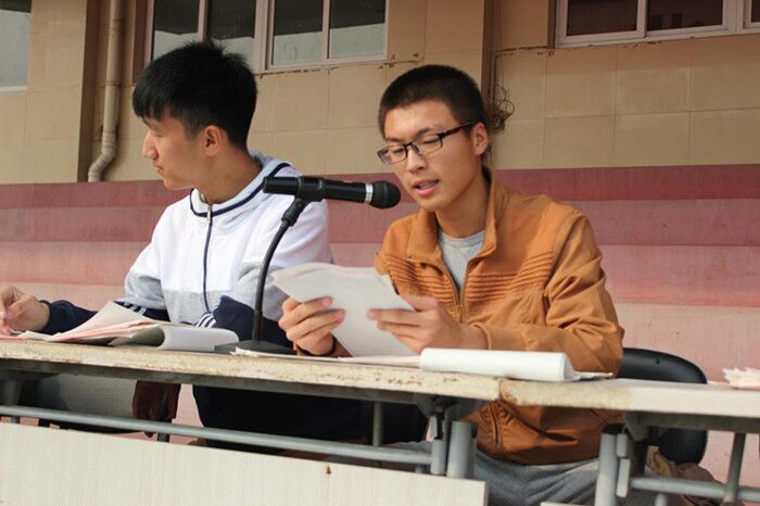 长桌,几把椅子,两个话筒,简单的陈设,却被厚厚的稿件占据了太大的空间,精选出最优秀的加油稿,用最响亮的声音加对于运动会健儿的鼓励传达到操场的每个角落。