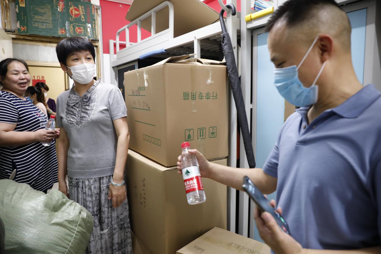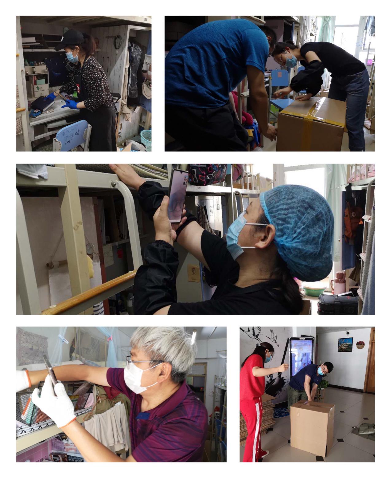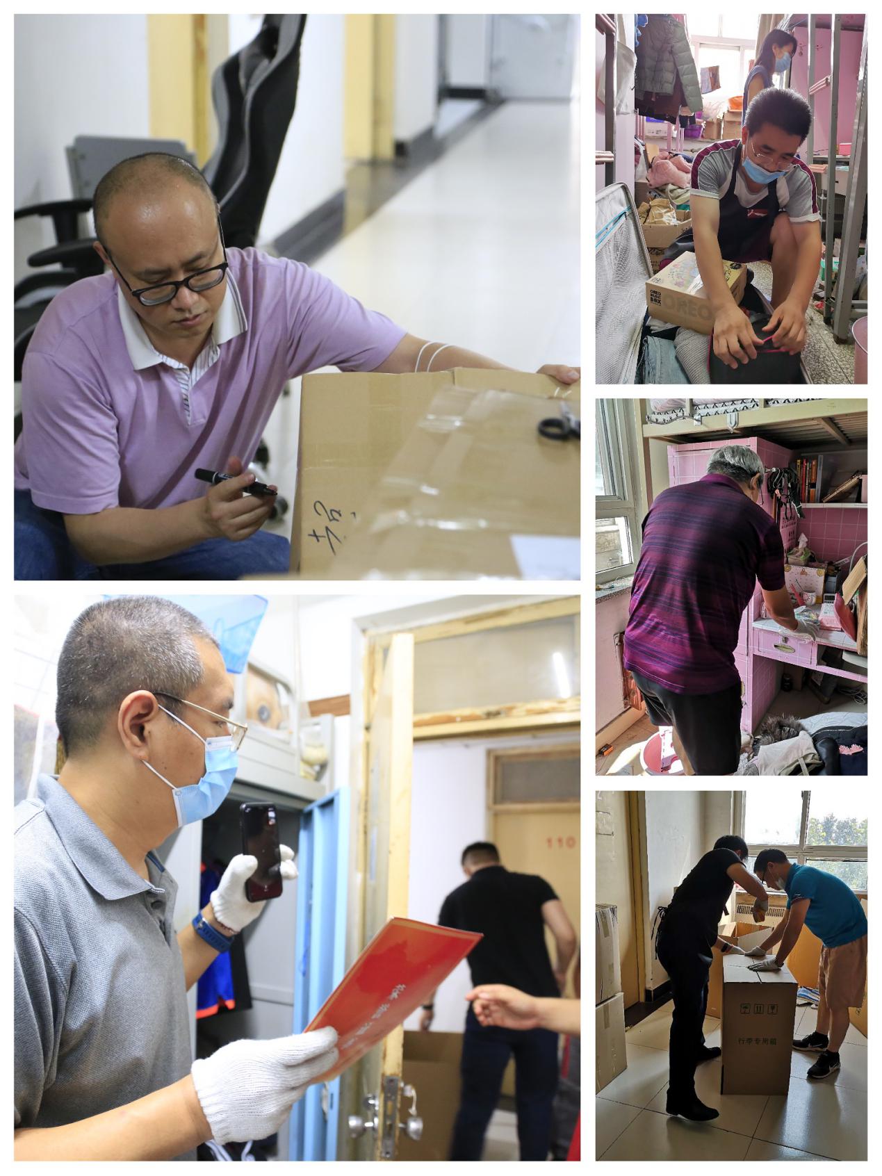 “这个要么?可以邮寄啊,这些都是你们的回忆……”张老师边直播,边熟络地和同学们聊着。爬到床上收床围子,钻到桌子下整理鞋子,分类、软包、装箱、封存、称重、邮寄,环环相扣。打包第一天,张勤老师和搭档邓程老师就完成了52个包裹的邮寄。第二天张老师腰伤复发,难以起身,还惦记着学生的物品称重寄存还未完成,坚持到岗。