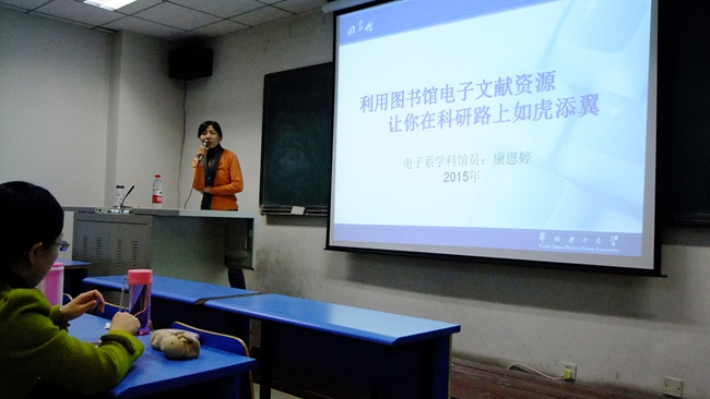 本网保定讯:由电子系研究生会举办的以“利用图书馆电子文献资源让你在科研路上如虎添翼”为主题的文献检索方法与论文写作的讲座在3月18日下午举行。此次讲座是电子系图书管理员康恩婷为大家带来的。这次讲座的目的是针对电子系的学生对常用的文献检索方式进行详细的讲解。让学生们在以后的论文写作中不再盲目。