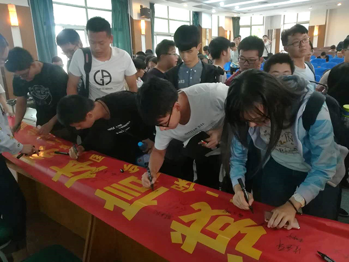 讲座结束后,同学们在“防范电信诈骗,维护诚信体系”的横幅上进行了签名。他们表示,李警官的讲座为自己留下了深刻的印象,通过聆听讲座,不仅对电信网络诈骗有了清楚的认识,提高了警惕,同时也会向家长和身边同学进行宣传,防止受到不法侵害。