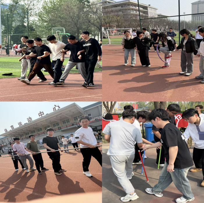 活动将趣味性与竞技性相结合,共设置“五人六足、不倒森林、协力取水、纸板渡河、牵手传环、夹球竞速、同心竹竿行”七个环节。“五人六足”赛道上,5 名队员挽手绑脚,喊着整齐的口号同步迈进,在30米直线赛道上向着终点全力冲刺;“不倒森林”项目里,队员们围圈持棍,在顺时针转动中保持专注,用精准反应完成10次转动挑战;在“协力取水”环节,队员们在标志线后相互配合,用三角夹精准取送矿泉水,在平衡与协作中比拼速度;在“纸板渡河”环节,队员们默契配合,以六块硬纸板为 “踏脚石”,在不触碰地面的前提下向终点进发,每一步都凝聚着团队的智慧与信任;在“牵手传环”中,同学们手拉手围成圆圈,让呼啦圈在不松手、不落地的前提下依次传递,在流畅配合中比拼速度与协作;夹球竞速中,队员们排成一列,用身体夹着气球稳步前行,全程守护气球不落地,在默契配合中冲向终点。“同心竹竿行”环节,大家横排并肩紧握长竿,同步前行、灵活绕障,在往返间考验着队员的步调与默契。活动现场氛围热烈,操场上回荡着同学们的欢笑与掌声,大家在共同完成挑战的过程中建立信任、增进理解,实现了运动健身与心理调适的双向促进。
