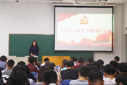 在党的章程方面,严立强调了党章的重要性,强调党章是党的根本大法,是各级党组织和全体党员的行为规范,是全党必须遵循的总规矩,要求认真学习党章,严格遵守党章。给出了政党章程的三个基本特征,接着讲述了党章的发展历史,介绍了党章的诞生和在从二大到十九大党章逐步发展与完善的过程,其中对十九大对党章进行的修改部分进行了重点讲解,并对照党章带着同学们梳理了十个方面的改变,其中亮点为将习近平中国特色社会主义思想写入党章。