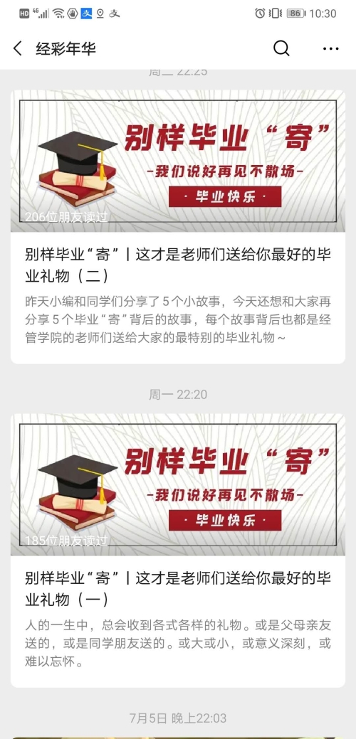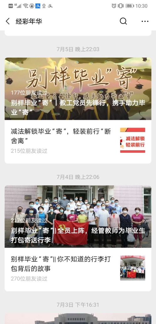 截止7月8日晚22点,学院党委微信公众“经彩年华”共发布推文7篇,累计阅读量5866人。