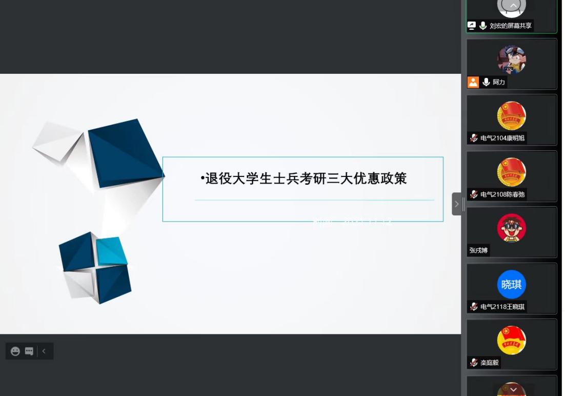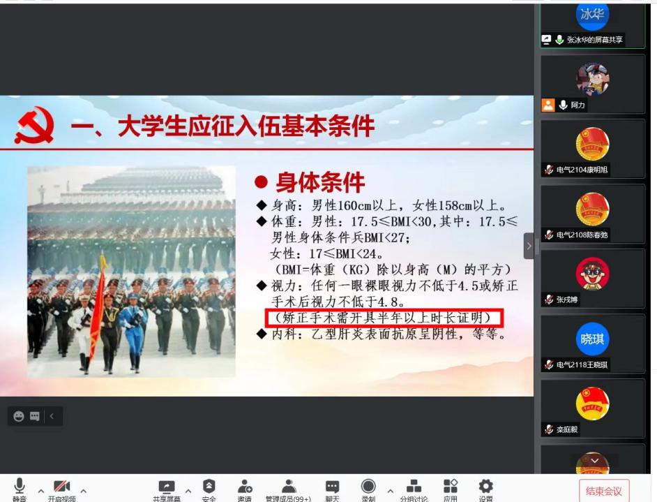 本网保定讯:为进一步加强大学生入伍征兵宣传工作,鼓励大学生积极应征入伍,提高兵源征集质量,5月12日下午,由电力系“迷彩青年”协会组织的“迷彩青年•政策知音•青年使命”征兵宣讲会通过线上会议的方式进行。党委武装部(保定)张冰华老师和“迷彩青年”协会会长、硕电力207班刘宏分别做了主题宣讲,会议由2020级辅导员阿力木江主持,全体协会成员及200余名本科生线上参加。