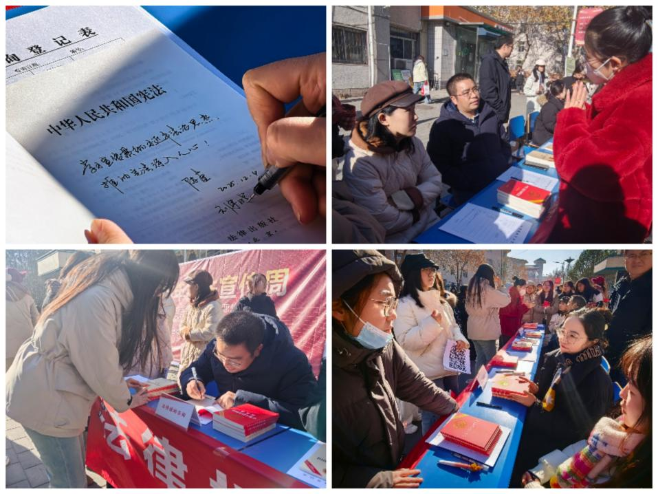 为进一步推动法治实践与校园生活相结合,当天午间,在二校区开展了法册签赠和法律援助咨询活动。法学教研室党支部教师党员向同学们赠送《中华人民共和国宪法》《中华人民共和国民法典》等法律读本,并亲手书写勉励赠言。法律援助咨询台则为学生提供了涉及消费权益、劳动合同、网络安全等方面的细致解答,将课堂理论延伸至现实场景,帮助学生提升依法维权的意识和能力。