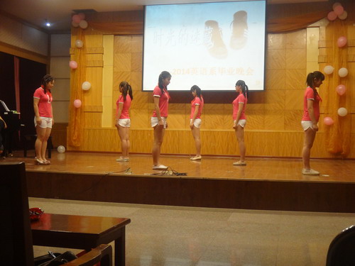 晚会首先以一段精彩的视频展示了大四毕业生对学弟学妹的鼓励和美好的祝愿。视频中他们每个人用自己的切身感受讲述了自己对大学生活的体会,并且希望学弟学妹们好好珍惜自己的大学时光,无悔于青春。而后一段精彩的街舞表演瞬间点燃全场气氛。紧接着精彩的节目继续呈现,带给观众们一场盛大的视听盛宴。由英语1301班的同学们带来的话剧《招聘会》讲述毕业生们面试时候的情景,演员们幽默出色的表演赢得了现场观众的热烈掌声。英语1202班的同学们带来了舞蹈《初智齿》,以其青春飞扬的舞姿和激情澎湃的旋律让现场气氛达到高潮。由英语1101班的同学们带来的歌曲连唱《北京东路的日子》更是赢得了观众的满堂喝彩。精彩的节目中间还穿插了游戏环节,同学们参与其中,乐在其中。