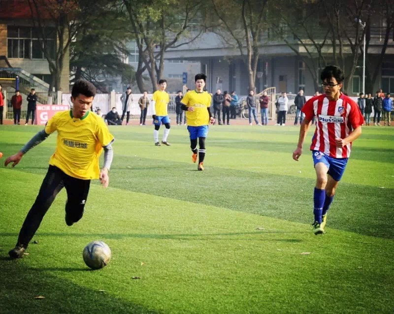 经过一个多月的拼搏奋战,华电竞技和熊猫冠城两支球队顺利突出重围,拿到了决赛入场券。参赛队员个个意气风发,斗志昂扬,用高亢的口号传达出了必胜的信念。随着裁判员的一声哨响,比赛正式开始。在上半场的比赛中,双方竞争激烈,场上高潮迭起,在开场39分钟时间内,双方势均力敌,旗鼓相当,球员多次带球过人,逼近球门,离进球只差一步之遥。当上半场即将结束时,场上平分的局面出现了逆转,熊猫冠城俱乐部10号陈鹏飞成功将球踢入华电竞技的球门,率先拿下一分,场外响起了阵阵激烈地喝彩声。随后,上半场结束,熊猫冠城队以一分优势暂时领先。