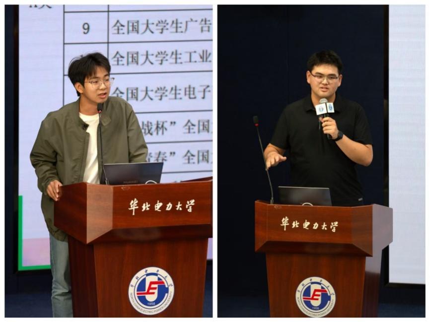 在经验分享环节,控制与计算机工程学院学生王宏超、电气与电子工程学院学生王楚涵结合自身参赛经验,从不同维度进行了精彩分享。王宏超以大创为切入点,锚定双创竞赛展开分享,阐述了竞赛的类别、选题、组队、材料准备等详细经验,并且强调了竞赛对于自身成长、团队价值和社会意义的深刻认识。