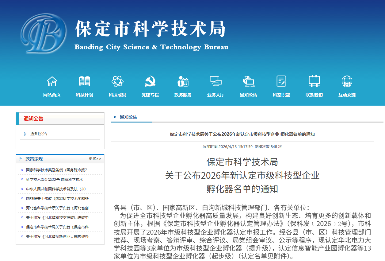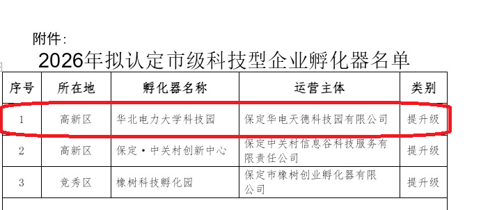 本网保定讯:近日,河北省工业和信息化厅、保定市科学技术局先后公布了2026年新认定科技型企业孵化器名单。我校科技园成功获评河北省科技型企业孵化器(先进级)、保定市科技型企业孵化器(提升级)。此次省、市“双重认定”,标志着科技园在科技企业孵化、创新生态构建方面迈入高质量发展新阶段。
