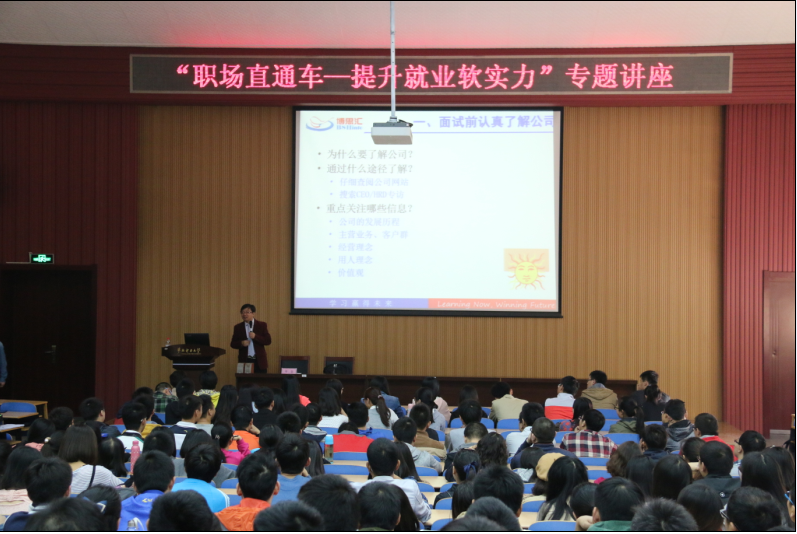 本网保定讯: 为进一步做好2016届毕业生职业指导工作,提高大学生就业竞争力,10月16日上午,第七届职业导航月系列活动之三——“职场直通车—提升就业软实力”专题讲座于保定校区教六一阶举办。本次讲座由北京博思汇信息技术有限公司副总裁、北京市高校就业指导中心特聘专家李晶主讲。就业指导中心程利敏老师以及来自各院系共计500余名毕业生听取讲座。