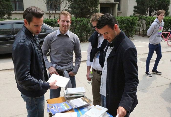 活动开始前,留学生就主动参与其中,帮助老师一同帮运一本本新书至活动地点。随着简单的交接仪式进行完毕,一批崭新的书籍摆在留学生公寓门口。留学生们都迫不及待地围到桌前,挑选自己感兴趣的书认真翻阅。虽然已经是午饭时间,可留学生们依然舍不得离开活动现场,手里拿着书饶有兴趣地翻看,碰到不懂的地方还会请教旁边的中国学生——手不释卷即是此刻留学生的真实写照。