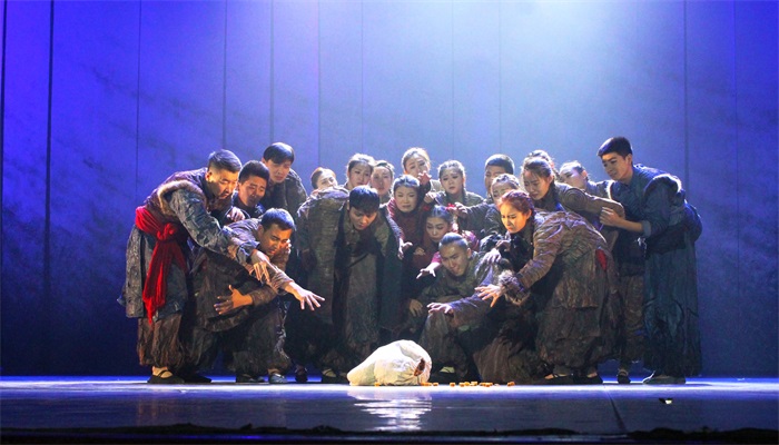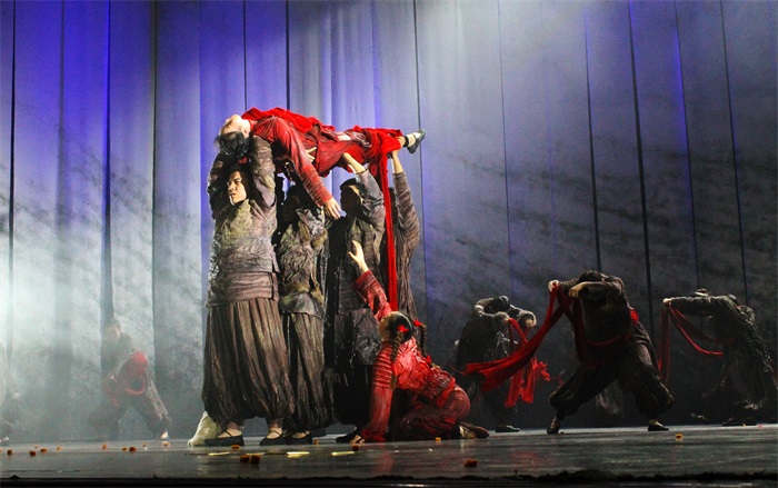 一阵低沉的钟声响起,演出正式开始。第一幕以白山黑水为背景,音乐激昂,舞蹈动作完美准确,震撼人心。主角的种子摔落在地,选择分给众人时的艰难,突如其来的轰炸,母亲去世时的悲痛。开篇的场景结合唢呐的音调,将跌宕起伏的剧情表现得淋漓尽致。接下来是一支欢快的秧歌舞,暖黄色的灯光,欢快明朗的曲风和情感突出的舞蹈充分体现了大丰收后的喜悦热闹,明显的东北元素使得情感表达锦上添花。大红色绸缎营造出的战争氛围将现场气氛推向高潮。丈夫战死沙场,女主角百合绝望中的突然产子及对丈夫的追忆让现场观众感动万分。孩子在不断长大,秧歌的传承从未停止,百合最终也要将孩子送上战场。她手把手地教着年幼的孙子跳起秧歌舞,伴随着高昂而富有穿透力的唢呐声,演出走向尾声。