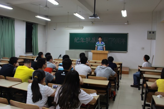 可再生能源学院、核科学与工程学院和外国语学院等学院分别开展了“传承精神、开创未来”班级活动,积极学习习总书记讲话精神。有班级开展了“二战的东方主战场”历史大讲堂活动,其中有老师以自己独特的见解,以中国钢产量这个具有代表性的又具有说明性的数字为线索形象地讲述了抗战的历史,讲述了中国共产党是如何领导人民军队和中国人民反败为胜,取得最后的胜利,并告诫我们要正视历史史实,不要戏剧化历史,做一个有理性思维的新青年,继承和发扬优秀的传统,铭记历史、承担责任、健康成长。也有班级组织了纪念抗战胜利的诗朗诵活动,通过诗歌的沉郁顿挫表达国土沦陷、同胞罹难的哀伤,慷慨激昂地歌颂万众一心、共赴国难的爱国情怀。还有班级播放了纪念抗战系列视频《血染山河:抗日战争简史》、《阅兵那些你不知道的事》、《This is China》等;甚至有班级结合党支部党建工作,开展“铭记历史·开创未来”的主题征文,后续准备参观抗战圣地——卢沟桥,进一步提高同学们的抗战认识与思想觉悟。
