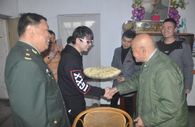 中午时分,在部队干休所所长的带领下,志愿者带着刚包好的水饺和提前准备好的礼物,来到了红军老战士的家。时光荏苒,八十年过去了,老战士虽不再年轻,但仍精神矍铄,身体健康,而且非常健谈。老战士跟志愿者谈了很多年轻时候的事儿,带领大家回顾了长征那一段艰难历史。临行前,告诫志愿者年轻一代是祖国的花朵,需要为实现伟大中国梦而脚踏实地、努力奋斗!