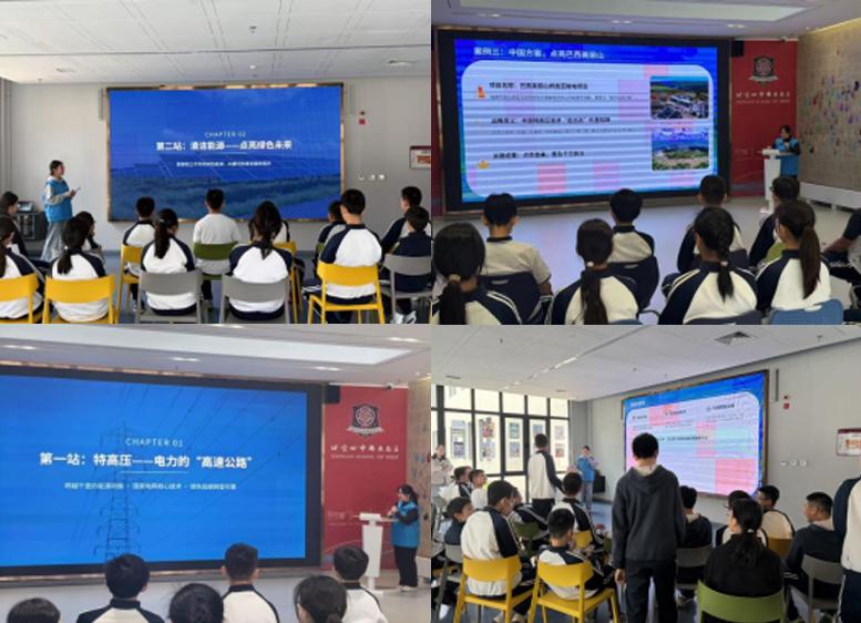 课堂上,团队成员通过讲授“特高压输电——电力高速公路“清洁能源——能源转型新引擎”、“科技赋能——电力系统智能化升级”三个部分,生动展现我国能源电力事业从“跟跑”到“领跑”的跨越式发展。通过讲述“3324公里的‘电力高速公路’,一头连着新疆戈壁的风电光伏,一头连着长三角的万家灯火”的疆电外送特高压典型案例,让同学们理解了电力资源的跨区域输送以及大国重器的硬核实力。讲授“清洁能源”时,党员们重点介绍了“双塔一机”光热电站、华龙一号核电、白鹤滩水电站等重大工程,阐释了太阳能、风能、核能、水能在构建清洁低碳能源体系中的重要作用,引导同学们树立“绿水青山就是金山银山”的绿色发展理念。