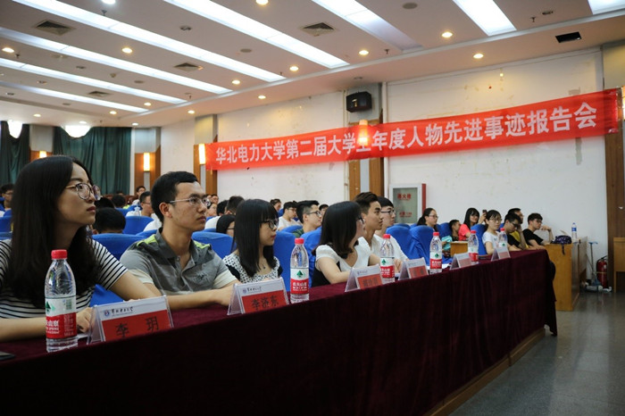 一段介绍大学生年度人物的视频短片拉开了报告会的序幕。六位大学生年度人物依次上台进行事迹报告。“科技之星”获得者李玥将自己参加科技创新活动的经历和感悟娓娓道来,她认为在双创的大环境下,大学生更应积极参与,尽力超越功利性,通过科技创新不断体悟科学的乐趣和价值。“勤奋之星”获得者李济东介绍了他坚持早起早读,坚持提高学习效率的经验,认为勤奋贵在坚持。“奉献之星”获得者郝苓羽分享了她志愿服务中的体会,倡议大家热心公益,服务社会,传递爱和正能量,履行青年责任。“自强之星”获得者胡蝶分享了她的成长经历以及参加创行世界杯的感受,向学弟学妹建议尽早明确目标,坚持不懈努力,勇于面对困难,做自强不息的大学生。“才艺之星”获得者B.F.L乐队通过讲述乐队的经历,鼓励大家发挥自身优势和特长,全面发展,勇于追梦。“团队之星”获得者华电纪念品团队讲述了他们的创业历程,用生动的事例阐述了他们在创业实践中对团队精神的理解。