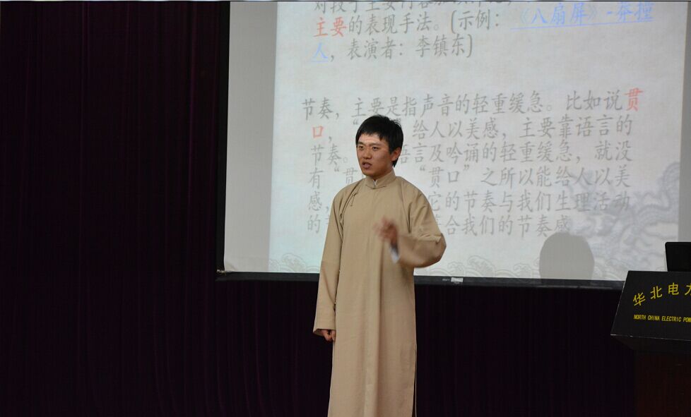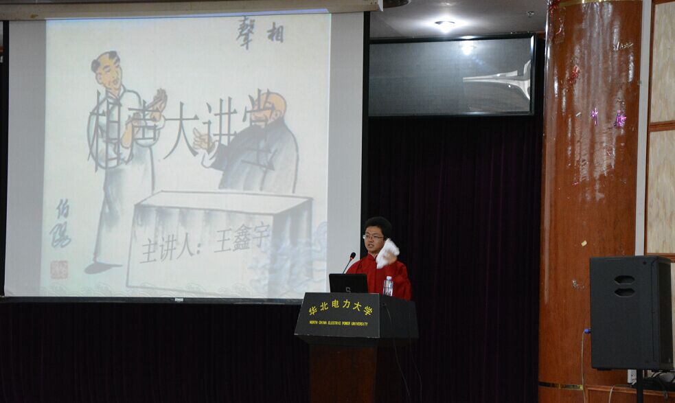 本次相声大讲堂的主讲人王鑫宇,标准理科男却拥有文科男一般流利的口才,字体行间穿插着令人捧腹的幽默。演讲展示分为两个部分,第一部分讲述什么是相声——形于相而发于声,随后又介绍了“学四相”和“学四声”——学相声的人必须练习两段基本技巧的段子。接下来他用大段篇幅区别了相声和笑话和戏剧的差别,中间插播马三立先生的经典包袱片段《逗你玩》,令人捧腹开怀。