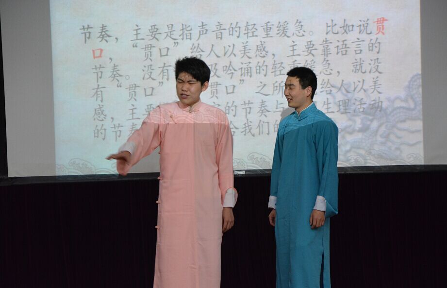 第二部分讲述了如何鉴赏相声,一是相声本子本身的好坏,相声本子结构包括“垫话”、“瓢把儿”、“正活”、“底”。通过专业的介绍,让听众们更加深入领会到相声的艺术底蕴。二是从相声表演的角度来鉴赏相声,“说”“学”“逗”“唱”都体现相声表演者的表演能力。现已经是研究生一年级的李镇东同学始终保持对相声的喜爱,活跃于一笑堂的排练和活动中,这次宣讲,李镇东表演了《八扇屏》中“莽撞人”片段,妙语连珠,语速轻快而又抑扬顿挫,赢得现场持久而热烈的掌声。即将大四毕业的杨志伟和现任一笑堂堂主刘伟东也联袂表演了相声经典片段《报菜名》,一口气报出108种菜名,令现场观众啧啧称赞,也让我们看到了相声表演者在台下每日勤奋练习的努力。两位大一的同学表演的《抬杠》,虽稍显青涩,表现还是可圈可点的。