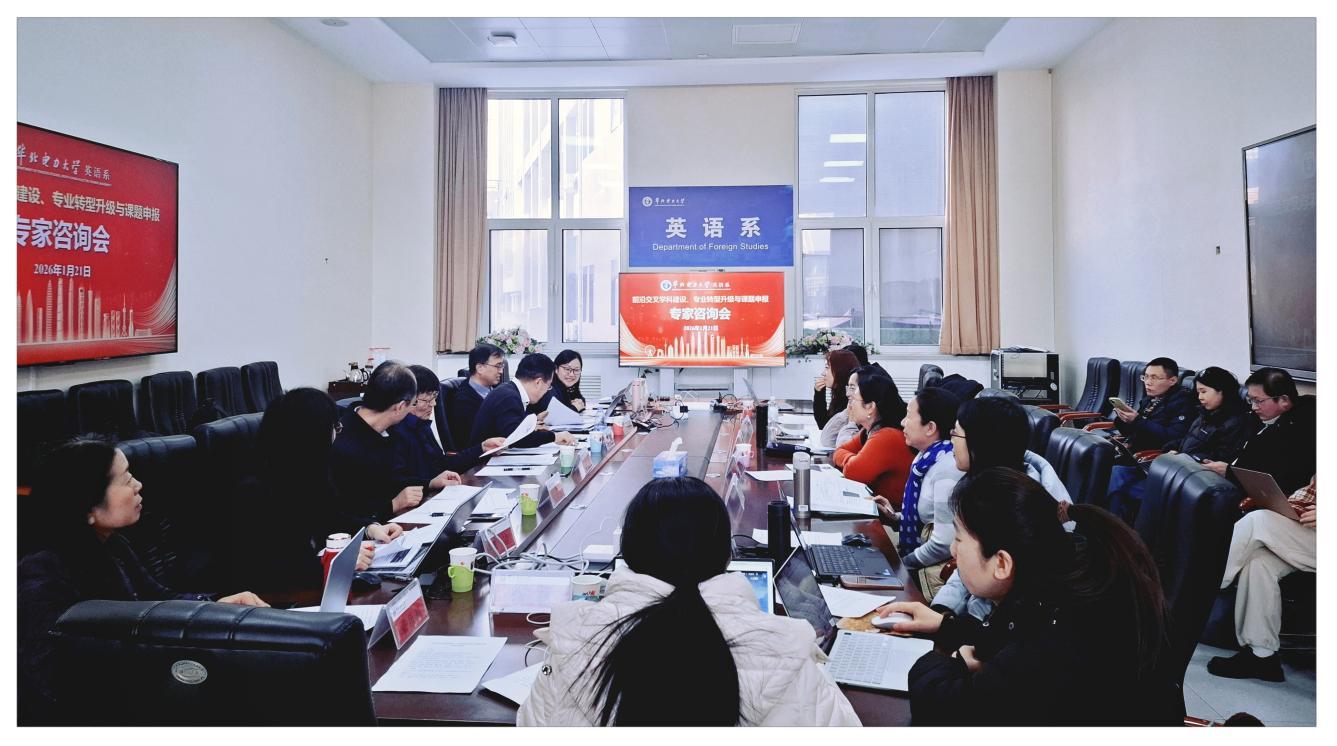 本网保定讯:为深入推进前沿交叉学科建设,系统谋划外语专业转型升级路径,提升高层次科研项目申报质量,2026年1月21日下午,英语系在教十一楼D106举办“前沿交叉学科建设、专业转型升级与课题申报专家咨询会”。本次咨询会邀请了国务院外国语言文学学科评议组成员、北京航空航天大学外国语学院院长梁茂成教授,北方工业大学文法学院书记袁凤识教授和华北电力大学马克思主义学院(保定)副院长王建红教授担任咨询专家。英语系行政负责人、教研室主任、硕士生导师、主任助理和青年博士教师参加了会议。