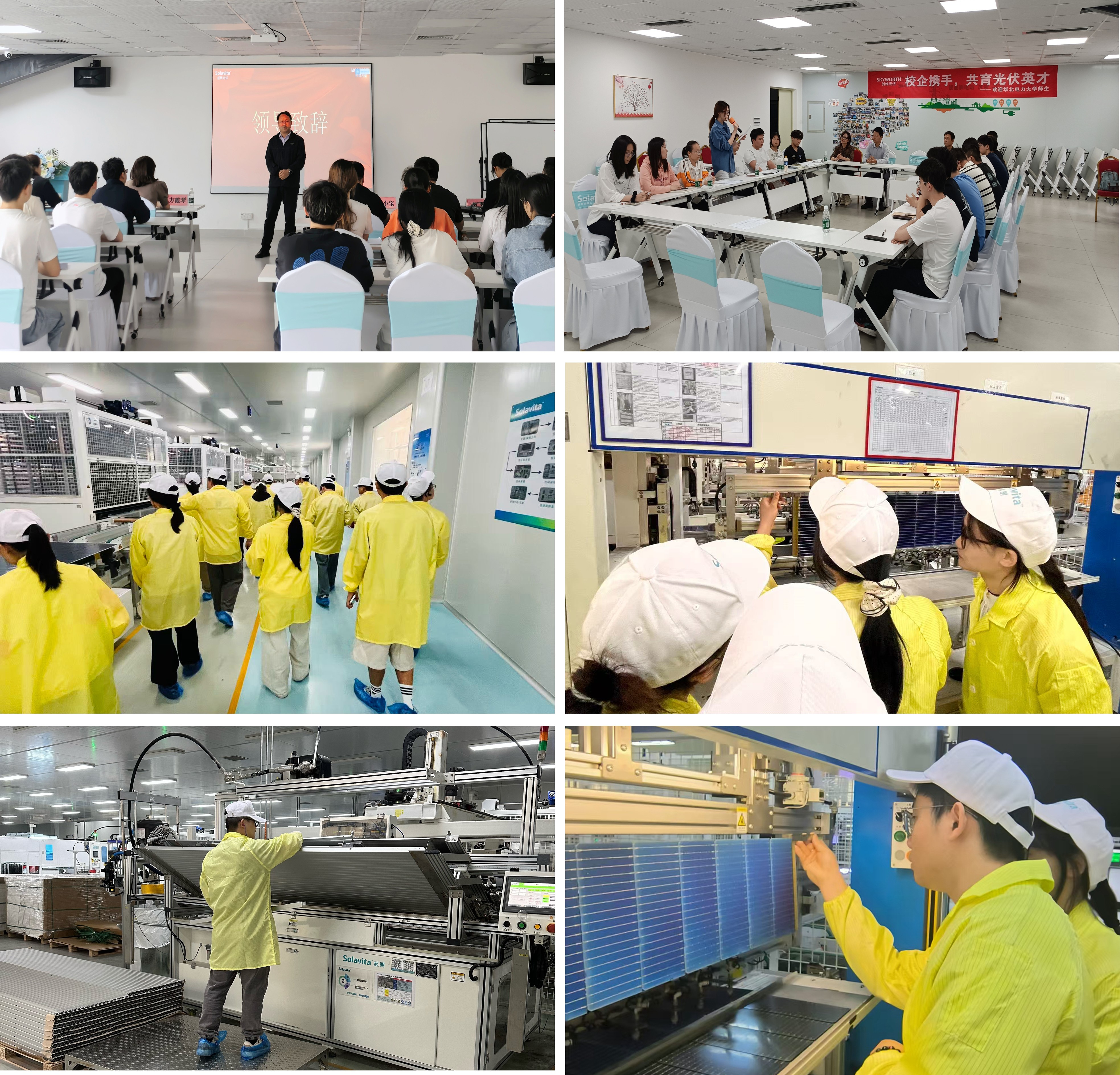 企业领导介绍了创维光伏公司的发展历程、实习安排、车间安全操作规范,同学们参观了光伏组件生产线,并分赴上料、EL检测等岗位,在师傅手把手指导下亲手操作设备,完成拉拔力测试、交联度测试、焊带长度检测等实操任务。此外,同学们还参观了创维光伏别墅示范项目,实地见证光伏组件与民用建筑的融合应用。钙钛矿实验室主任杨铁斌博士与乐耀昌博士共同作钙钛矿太阳电池专题讲座,学院刘雪朋副教授提供专业支持,实现校企协同育人的无缝衔接。