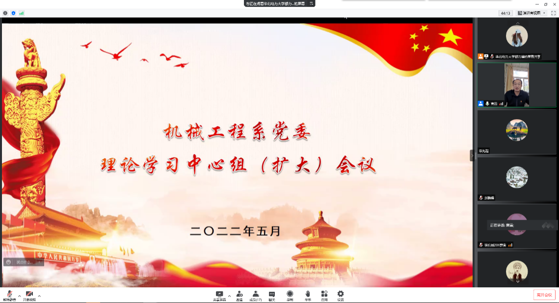 本网保定讯:5月12日,机械工程系党委召开理论学习中心组(扩大)会议,专题学习习近平总书记在庆祝中国共产主义青年团成立100周年大会上的重要讲话精神,系党委书记商雷传达了周坚书记、杨勇平校长在学习贯彻习近平总书记在中国人民大学考察时重要讲话精神开展学风教风作风建设启动会上的讲话精神。会议对《加强学风教风作风建设行动方案》以及《关于开展形式主义、官僚主义问题自查自纠工作的通知》的有关内容进行了学习和部署。系理论学习中心组全体成员、党委组织部(保定)副处级组织员秦芳芳、机械系全体党支部书记、系团委书记参加会议。会议由商雷同志主持。